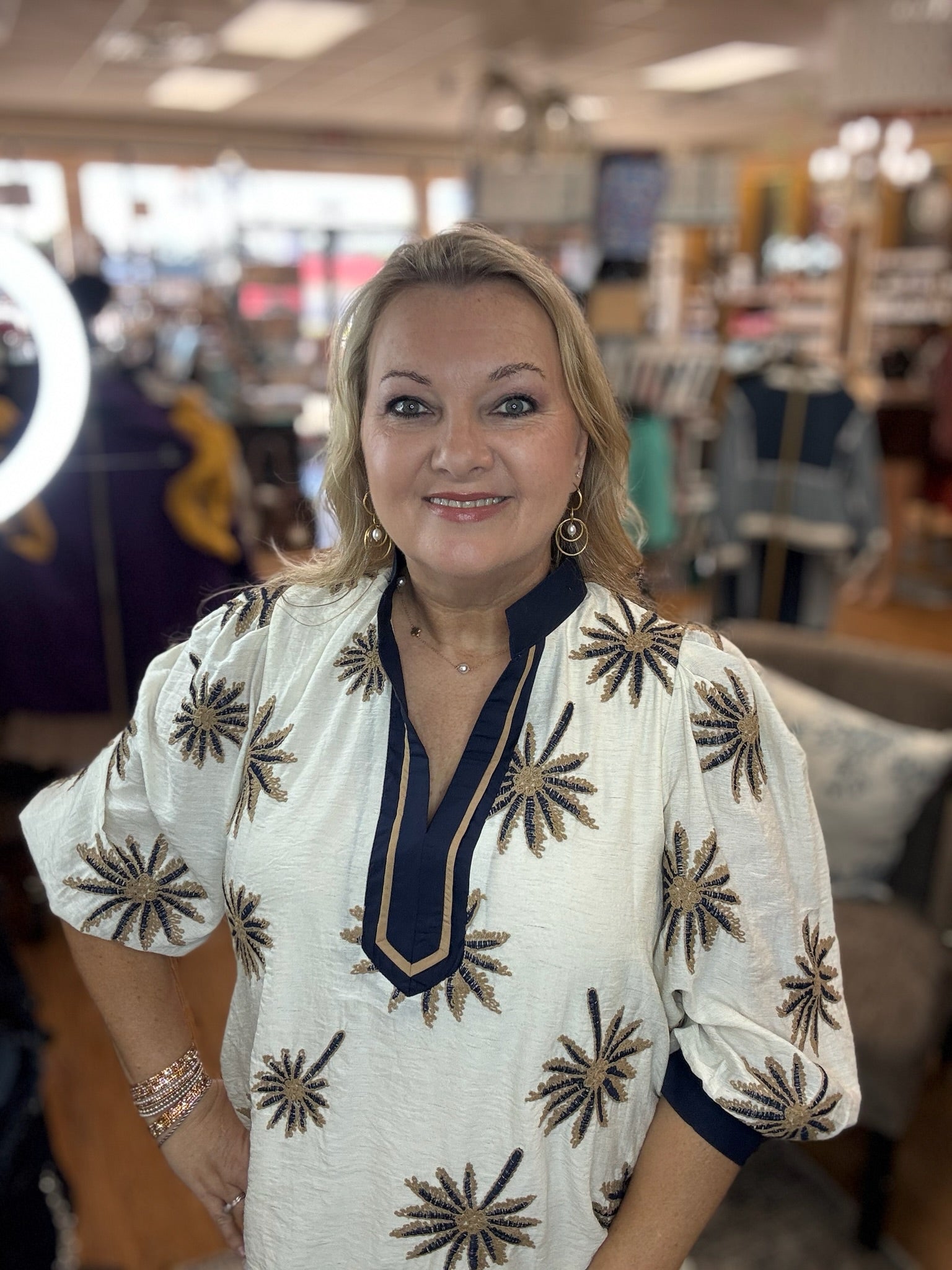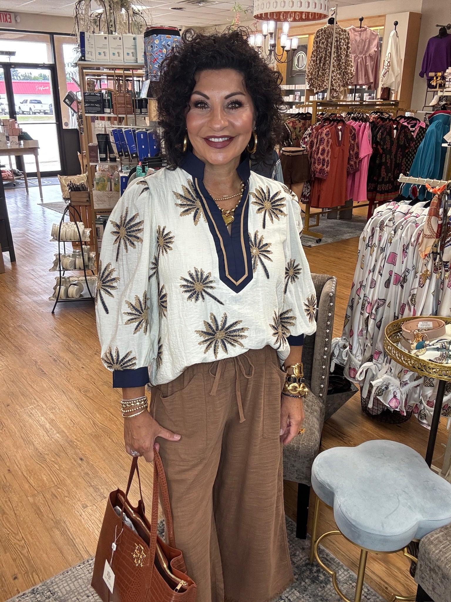 Botanical embroidery 3/4 puff sleeve top featuring contrast V-neck band