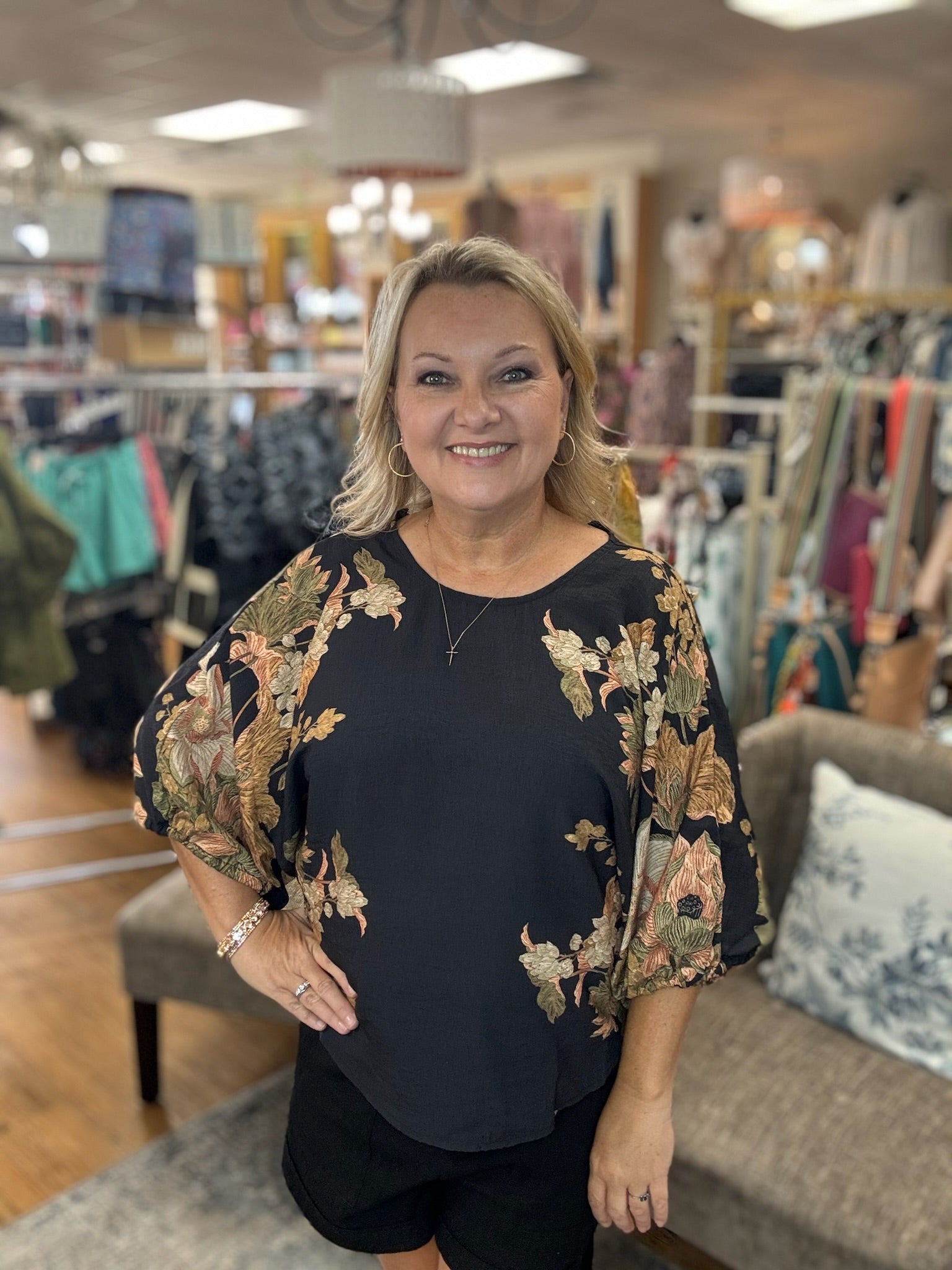 Botanical print ¾ sleeve puff top featuring textured fabric