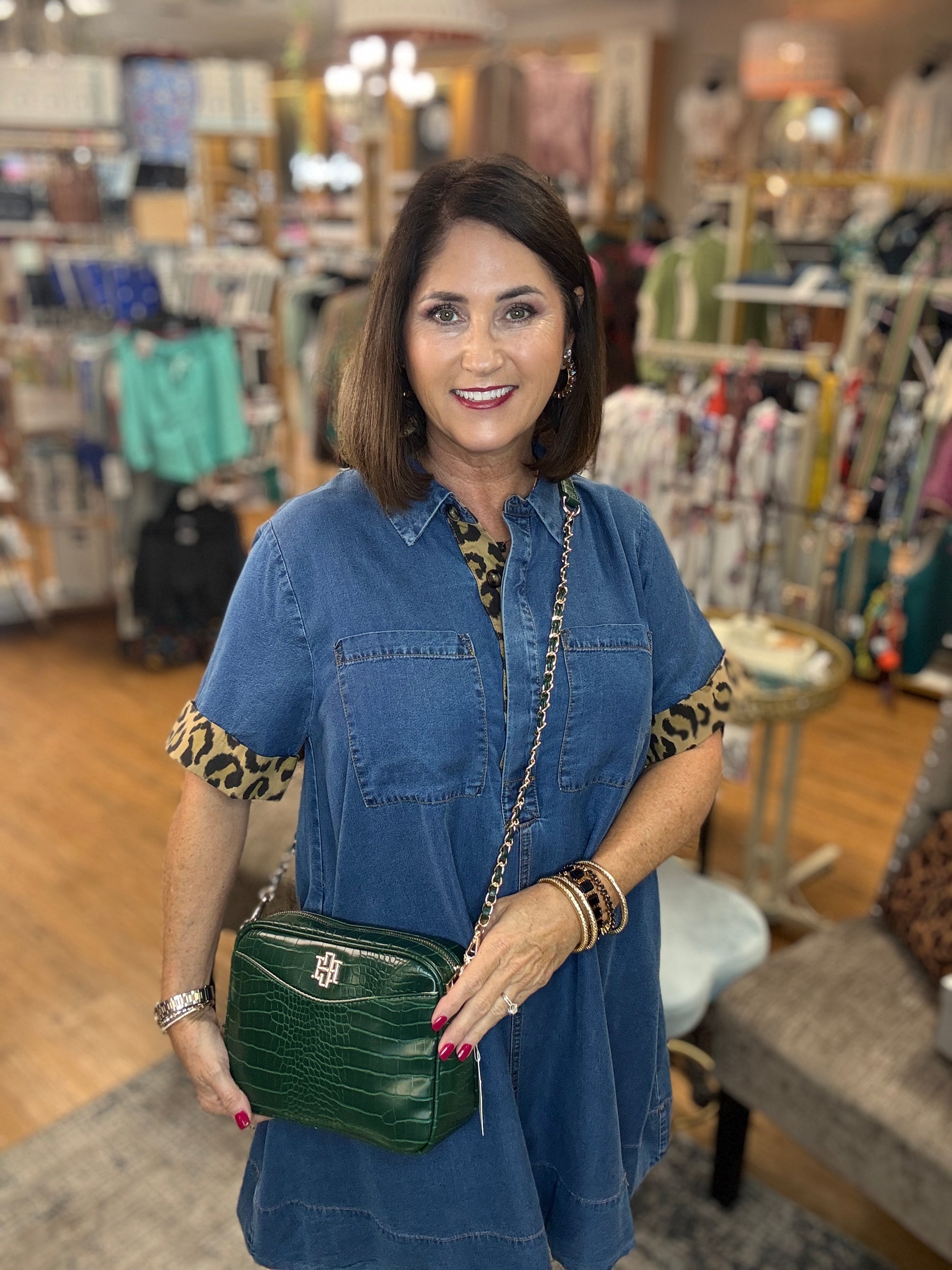 Chambray collar button front mini dress featuring leopard pattern cuff