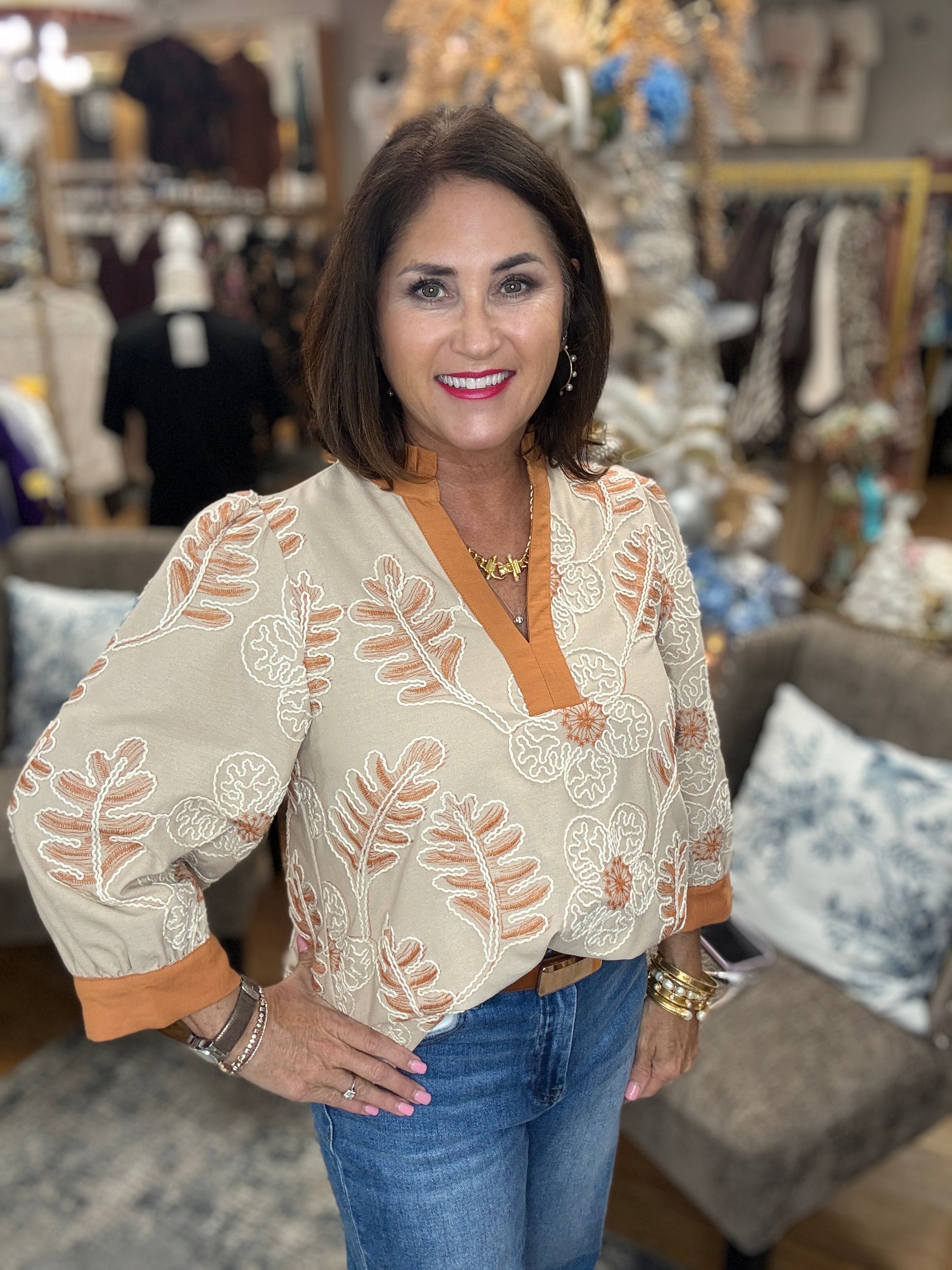 Floral Embosed 3/4 Sleeve Top w/Ruffle Trim