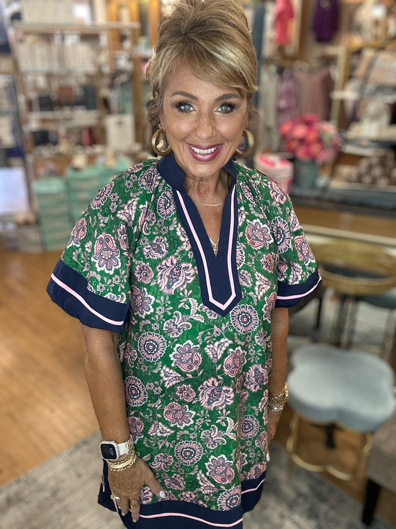 Floral paisley print pullover mini dress featuring contrast accent bubble sleeve and hem