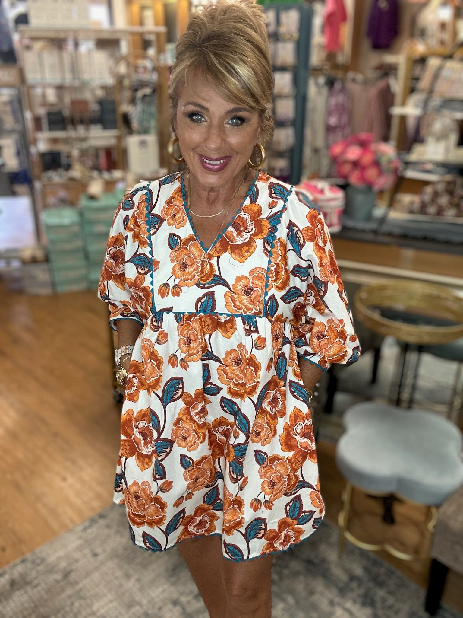 Floral pattern V-neck cuff band ¾ sleeve pullover mini dress