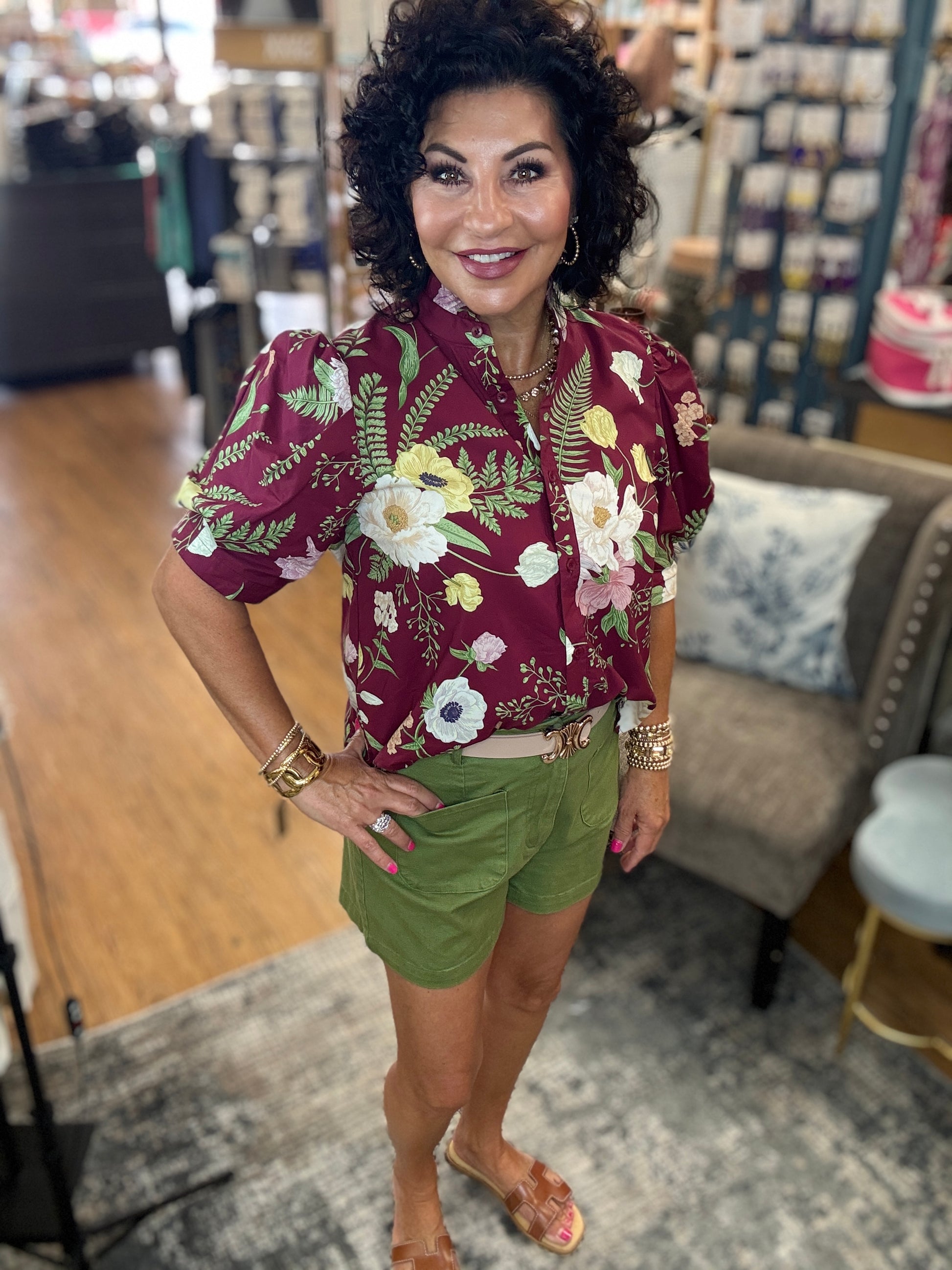 Solid high waist shorts. Classic button zipper closure at front. Patch pockets at front and faux welt pockets at back. Unlined. Woven. Non-sheer. Lightweight.