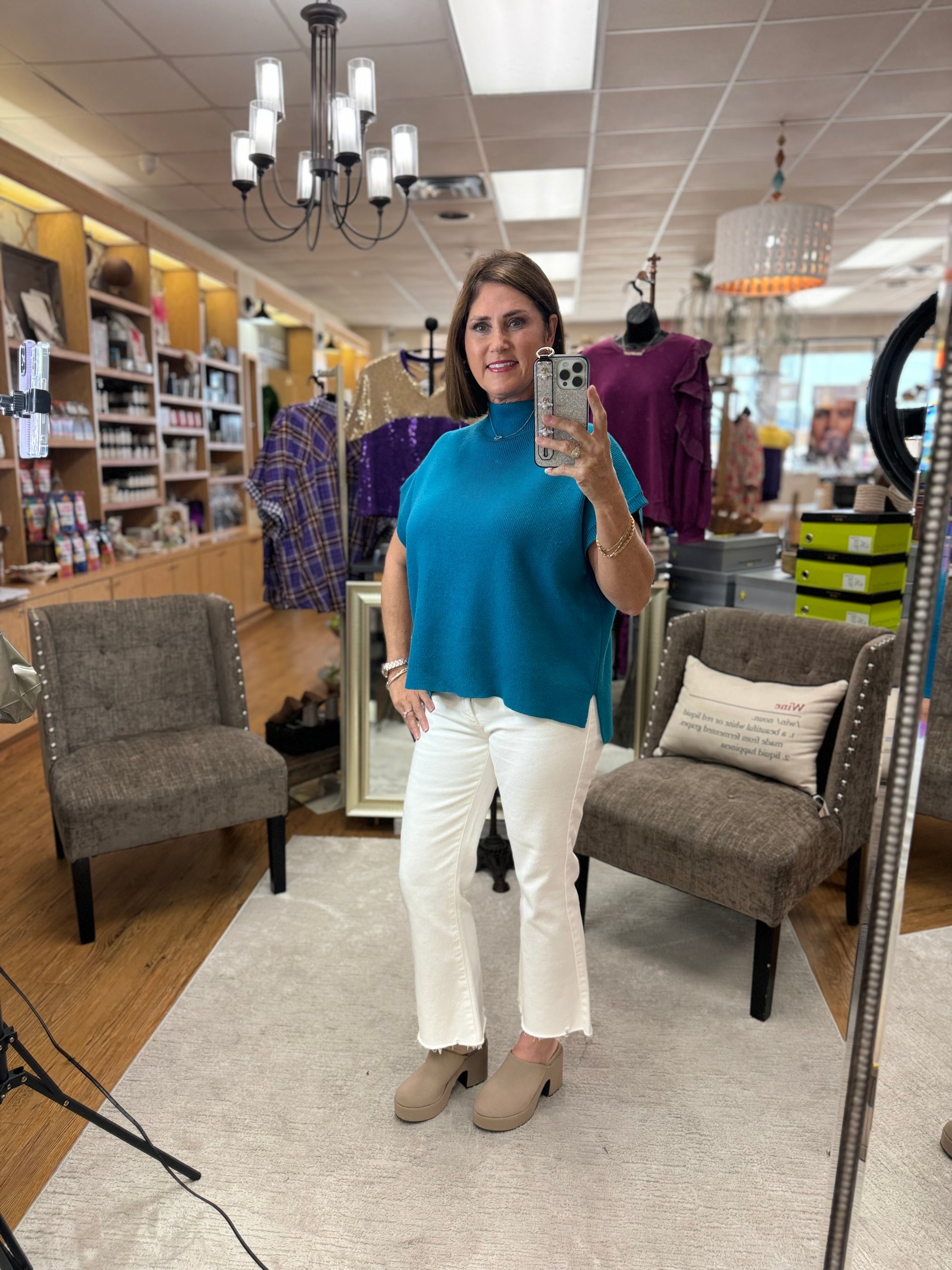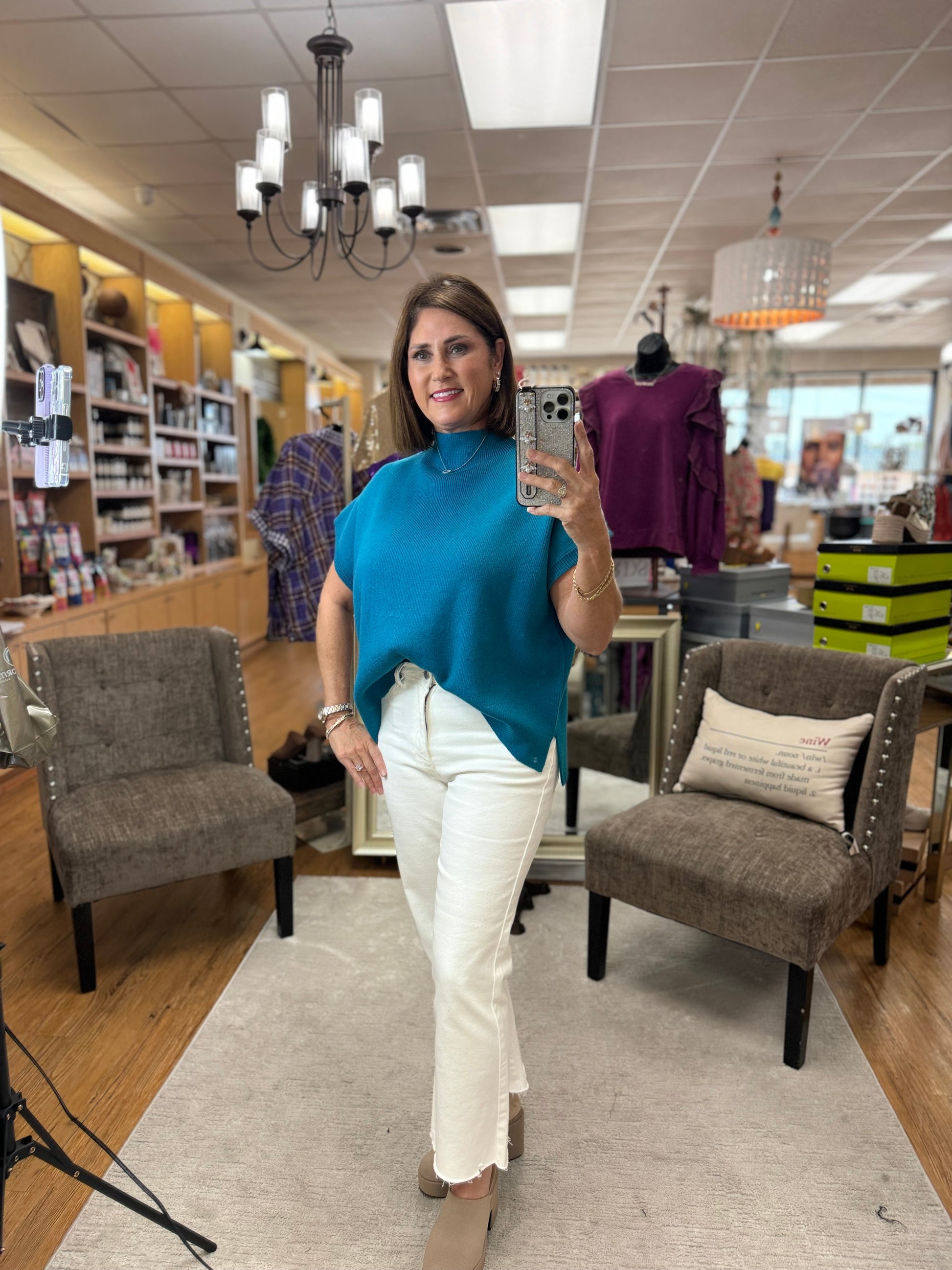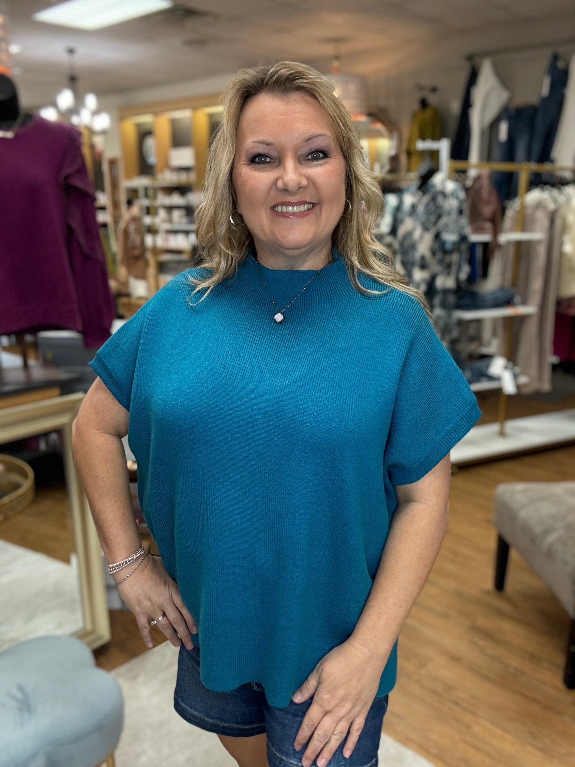Ribbed knit top with mock neck, short dolman sleeves, side and cuffs slit detail.