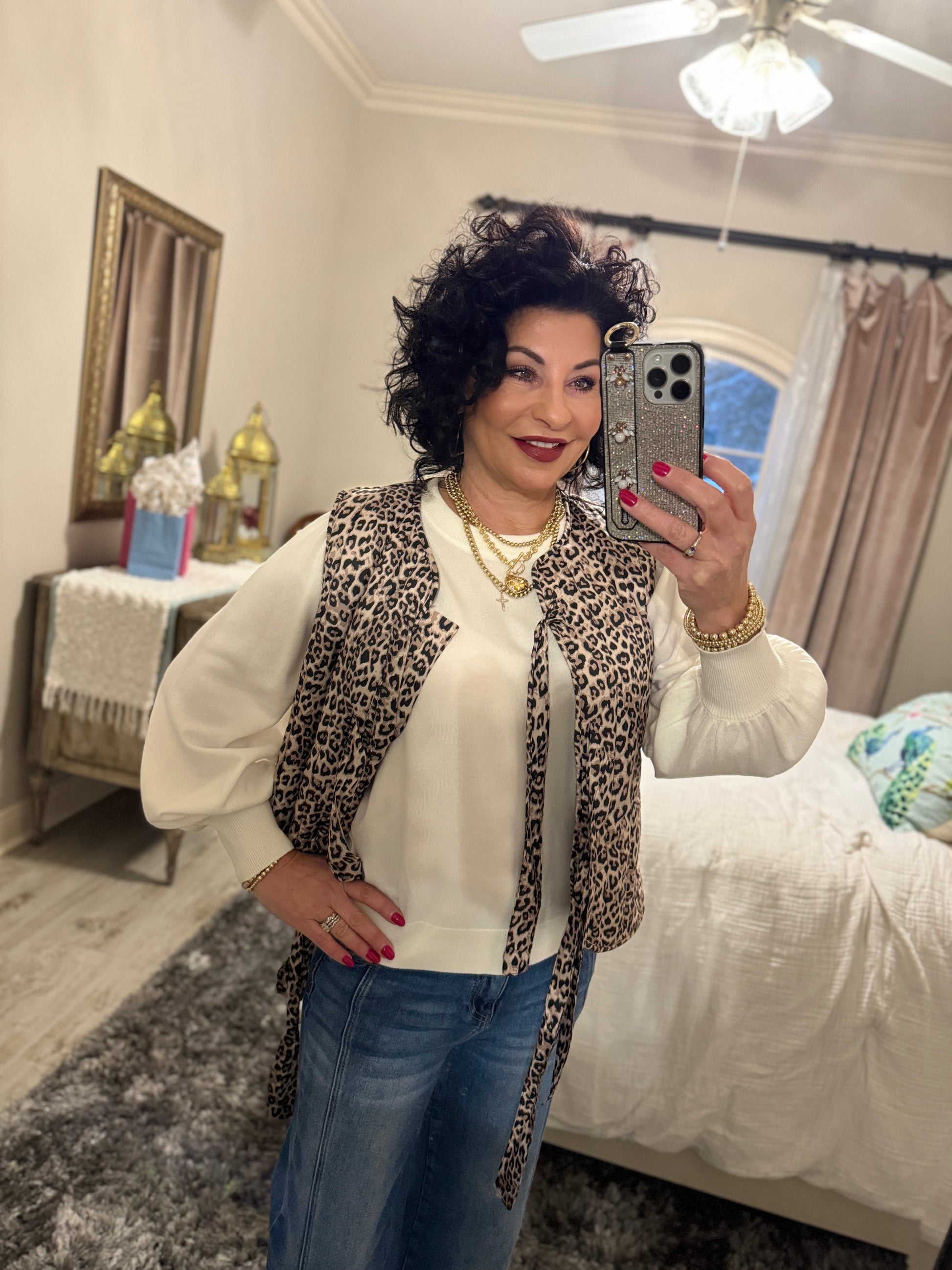 Solid knit pullover top with crew neckline, puffed voluminous sleeves, ribbing at the sleeve ends and hemline.