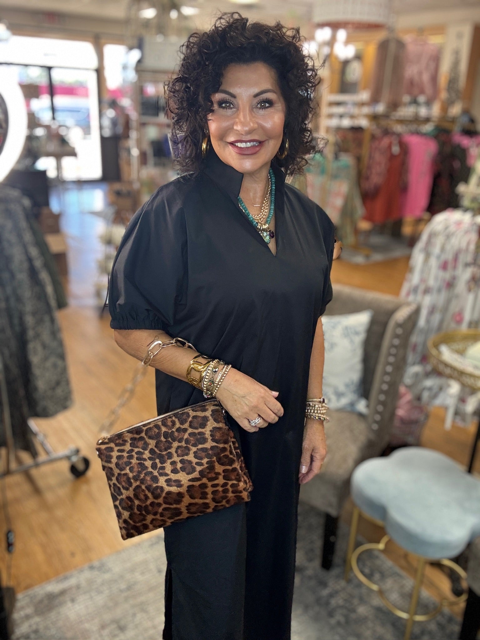 Solid short puff sleeve midi dress featuring band collar with V-neckline